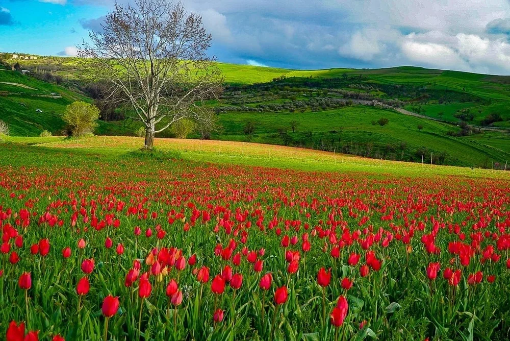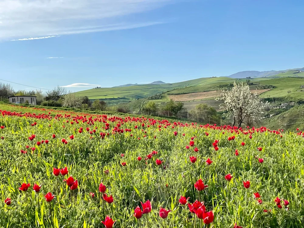 In Sicily, there is also a beautiful field, with red tulips, and a nice panorama with mountains!