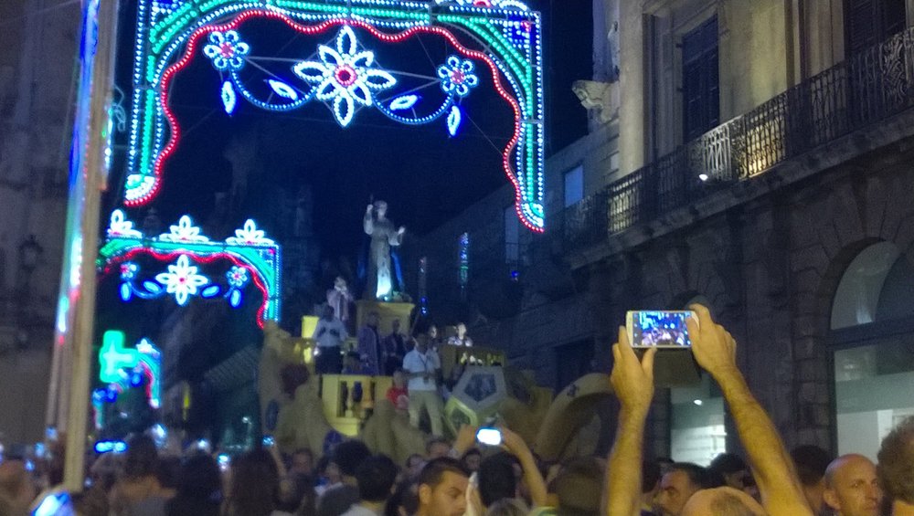 For the event, a big float is built with the statue of Saint Rosalia. People from all over the city walk behind the float and ehen the parade and the huge crowd arrives at Foro Italico, there is always a spectacular firework show and everyone yells out: “Viva Palermo e Santa Rosalia,” long live Palermo and Saint Rosalie. During this time in Palermo, some streets are also decorated with lights, pictures of the Saint, and altars with her statue.
